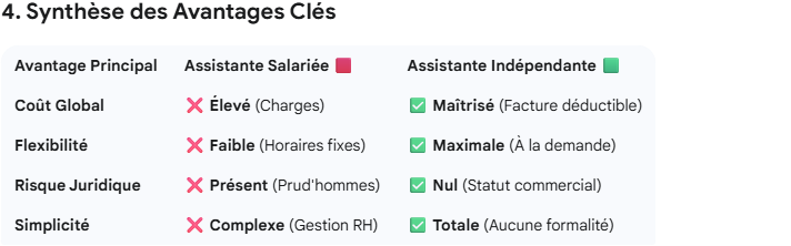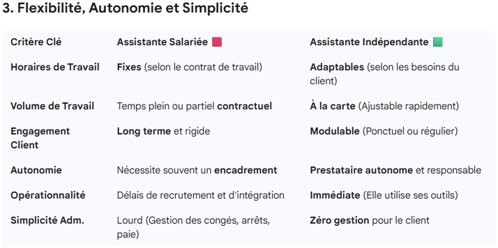 ✅ L’indépendante n’est pas soumise au Code du travail : pas de gestion RH, pas de risques juridiques, pas de contraintes sociales.