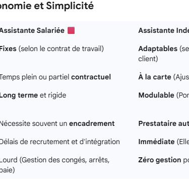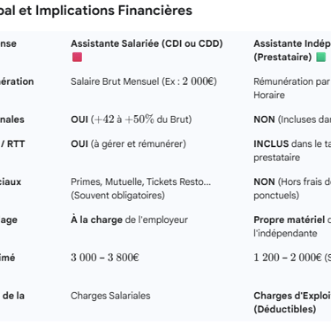 Entre contraintes salariales, risques juridiques et lourdeurs administratives, les dirigeants de TPE, professions libérales et entrepreneurs cherchent des solutions agiles. Ce guide compare les avantages concrets d’une assistante indépendante face à une salariée : économies, flexibilité, autonomie, sécurité juridique et optimisation fiscale. Une lecture essentielle pour faire le bon choix.