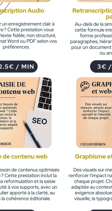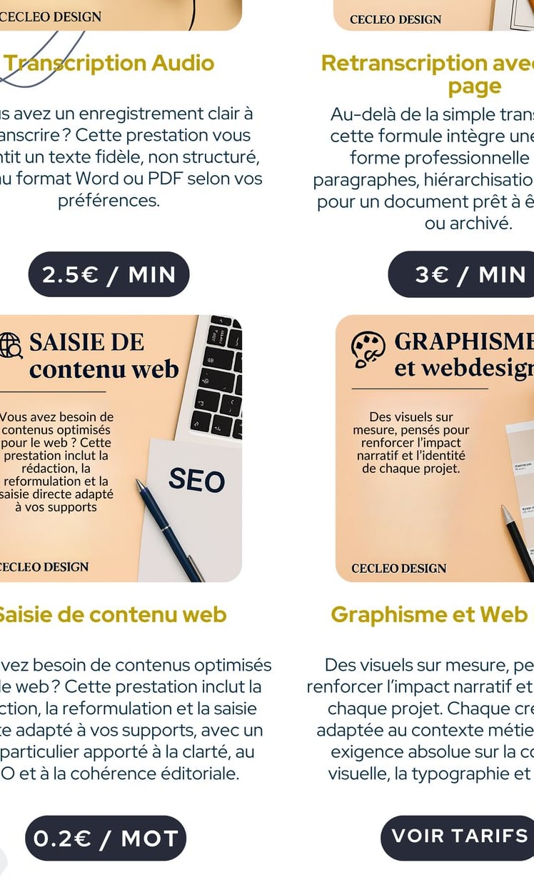 Conditions spécifiques : les tarifs peuvent être ajustés selon la complexité, l’urgence ou les demandes hors zone.